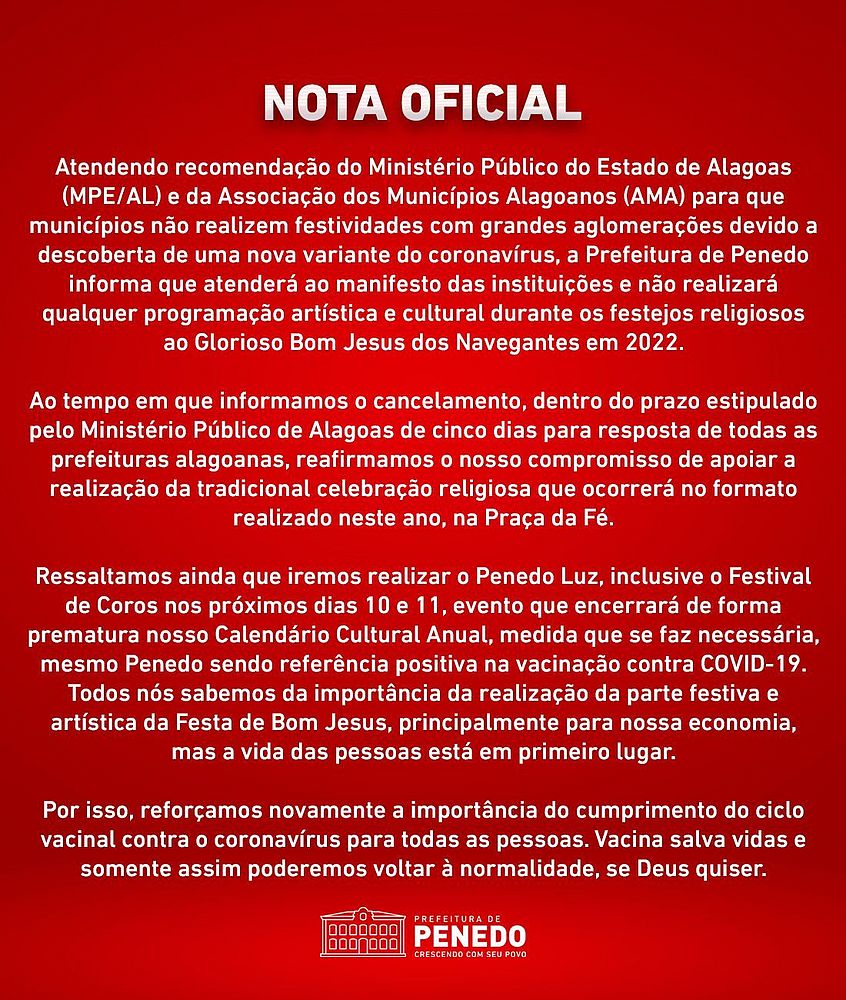 "A Prefeitura de Penedo informa que atenderá ao manifesto das instituições e não realizará qualquer programação artística e cultural durante os festejos religiosos ao Glorioso Bom Jesus dos Navegantes em 2022", consta na nota oficial enviada à imprensa.