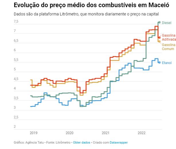Na média do mês de junho, o preço da gasolina comum foi de R$ 7,19 nos postos de Maceió, a maior média desde dezembro de 2018, quando a plataforma começou a coletar e armazenar os dados. Já neste mês de julho, a média registrada, até o momento, é de R$ 6,58.