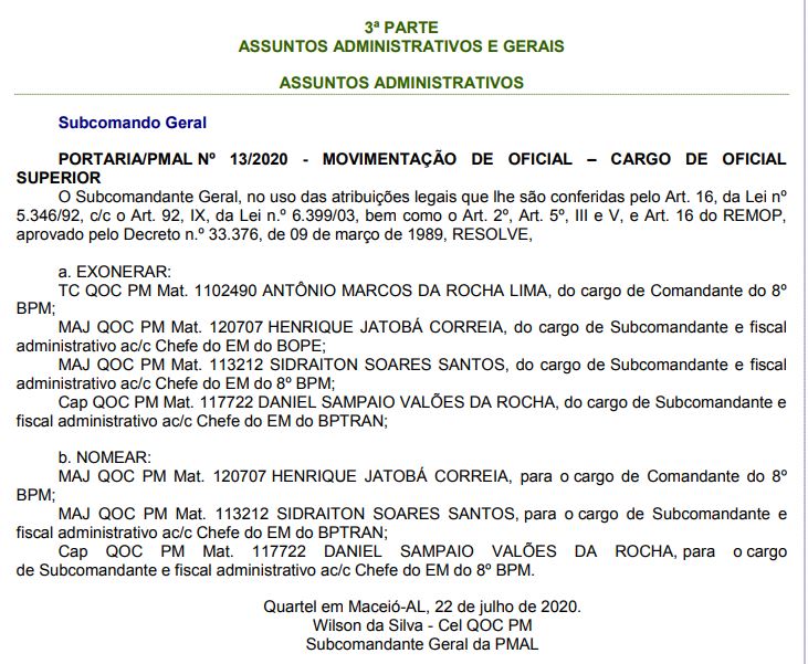 Além dele, o subcomandante do 8º BPM, major Sidraiton Soares Santos, também foi exonerado. No lugar dele assume o capitão Daniel Sampaio Valões da Rocha. Para o lugar de Rocha Lima foi designado o major Henrique Jatobá Correia.