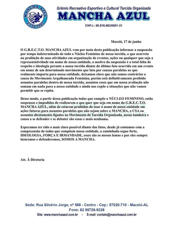 Na noite dessa segunda-feira (17), a diretoria da Mancha Azul publicou uma nota com a informação da suspensão de todo o núcleo feminino por tempo indeterminado, com o impedimento das torcedoras vestirem a camisa da organizada ao irem para o estádio ou no dia a dia, como também impossibilitadas em participar de ações sociais promovidas pela torcida.