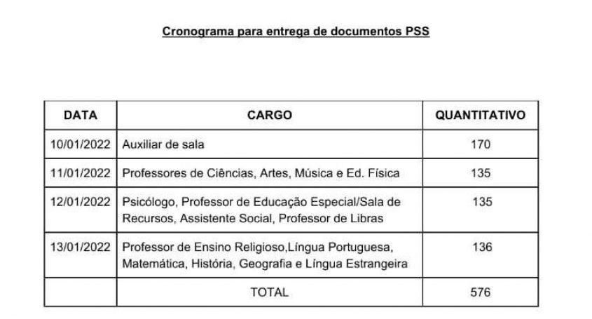 Nesta segunda-feira, devem comparecer os aprovados para o cargo de auxiliar de sala. No dia 11, será a vez dos professores de Ciência, Artes, Músicas e Educação Física. No dia 12, entregam a documentação os psicólogos, os professores de educação especial/sala de recursos, assistentes sociais e professor de Libras. Por fim, no dia 13, será a vez dos aprovados para os cargos de professor de Ensino Religioso, Língua Portuguesa, Matemática, História, Geografia e Língua Estrangeira.