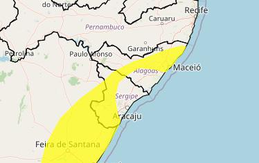 Já o segundo alerta, de cor amarela, que representa "Perigo Potencial", é válido para Maceió e mais 57 municípios alagoanos. Para essas regiões, a meteorologia aponta para chuva entre 20 e 30 mm/h ou até 50 mm/dia, além ventos intensos que podem chegar a 60 quilômetros por hora. Ainda há baixo risco de corte de energia elétrica, queda de galhos de árvores, alagamentos e de descargas elétricas.