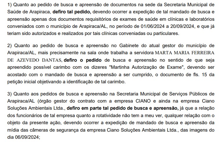 Na decisão, o juiz eleitoral da 22ª Zona de Arapiraca, André Gêda Peixoto Melo, deferiu os pedidos de busca e apreensão de documentos na Secretaria Municipal de Saúde; e no gabinete do prefeito, mais precisamente na sala onde trabalha a servidora Marta Maria Ferreira, para aprender documentos com o possível carimbo com os dizeres "Martinha Autorização de Exame".