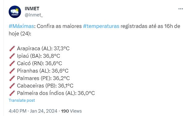 De acordo com o órgão, os termômetros em Arapiraca, no Agreste, atingiram 37,3°C — maior temperatura registrada no país nesta quarta-feira. Os municípios de Piranhas (36,6°C) e Palmeiras dos Índios (36,0°C) também aparecem na lista divulgada pelo Inmet (veja abaixo).