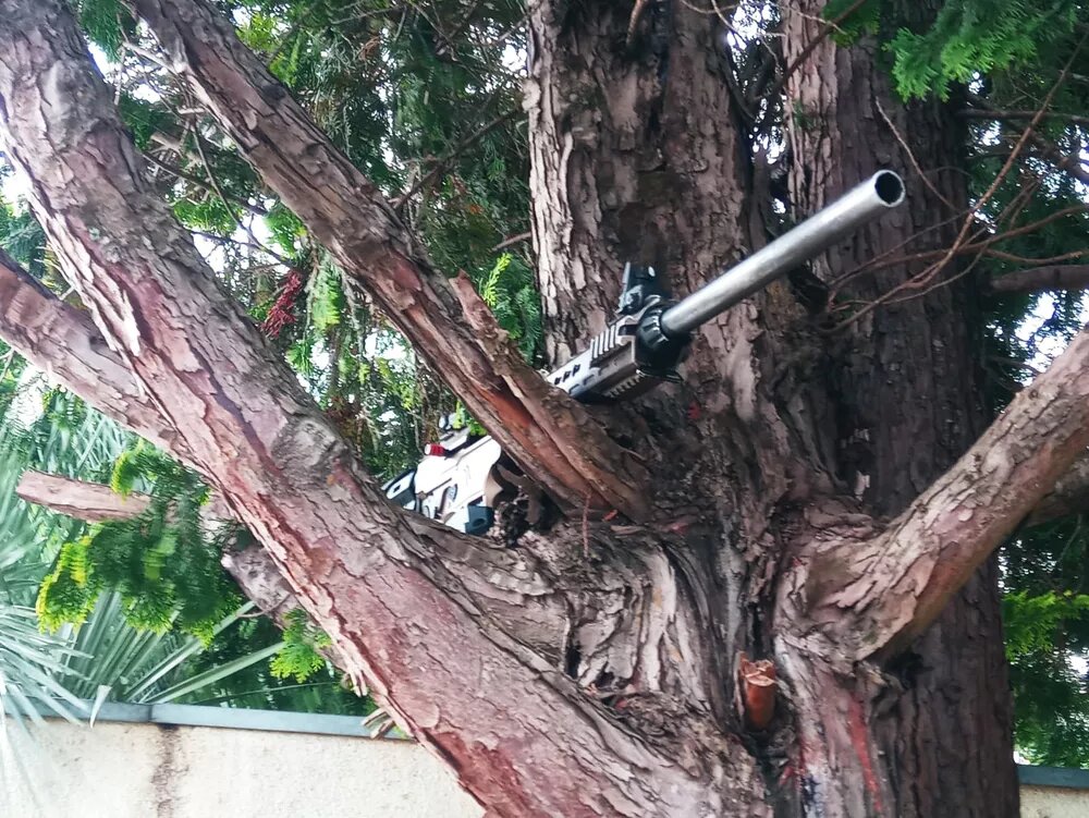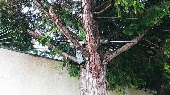 A arma está em uma árvore que fica em uma rua do bairro dos Estados, próximo à sede da empresa de transporte de valores. Um especialista ouvido pela reportagem disse que a arma aparenta ser um fuzil automático.