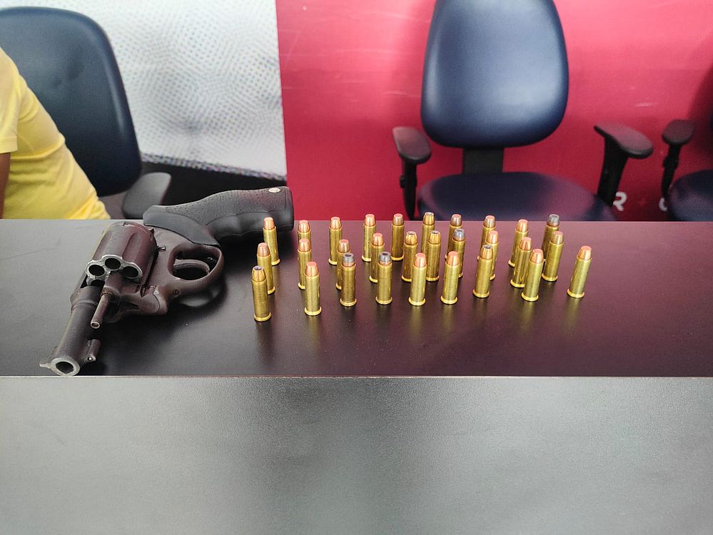 As guarnições Força Tarefa Pelopes 01 e 02 estavam em patrulhamento quando visualizaram dois indivíduos próximos a um terreno baldio. Eles tentaram pular o muro de uma residência quando notaram a aproximação da das viaturas. Diante da suspeita, foi realizada a abordagem, que constatou o ilícito. Ambos foram conduzidos à Central de Polícia Civil. Um dos indivíduos foi autuado por orte ilegal de arma de fogo e o segundo por consumo de drogas.