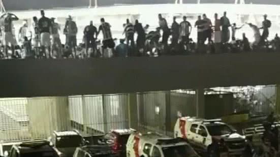 Os dois registros mostram claramente que há movimentos nas estruturas de concreto do estádio, o que assusta quem assiste, mas parece não assustar quem está no local, que comemora o resultado do jogo.