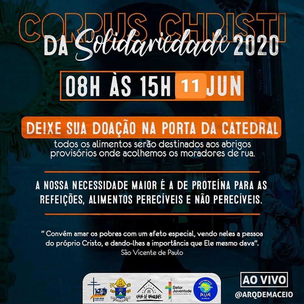 Um dos dias mais importantes para a Igreja Católica é a celebração de Corpus Christi, onde comumente as ruas da Cidade são tomadas pelos “tapetes” e pela procissão com o Santíssimo Sacramento. Esse ano, tendo em vista a pandemia que enfrentamos, a Arquidiocese de Maceió suspendeu a procissão, mas irá fazer um grande dia de coleta de donativos para a população carente.