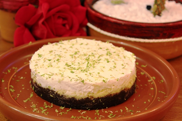 Adorável – Cheesecake de limão vem sobre uma base crocante de chocolate, coberta com chantilly e raspas de limão. Para compartilhar.