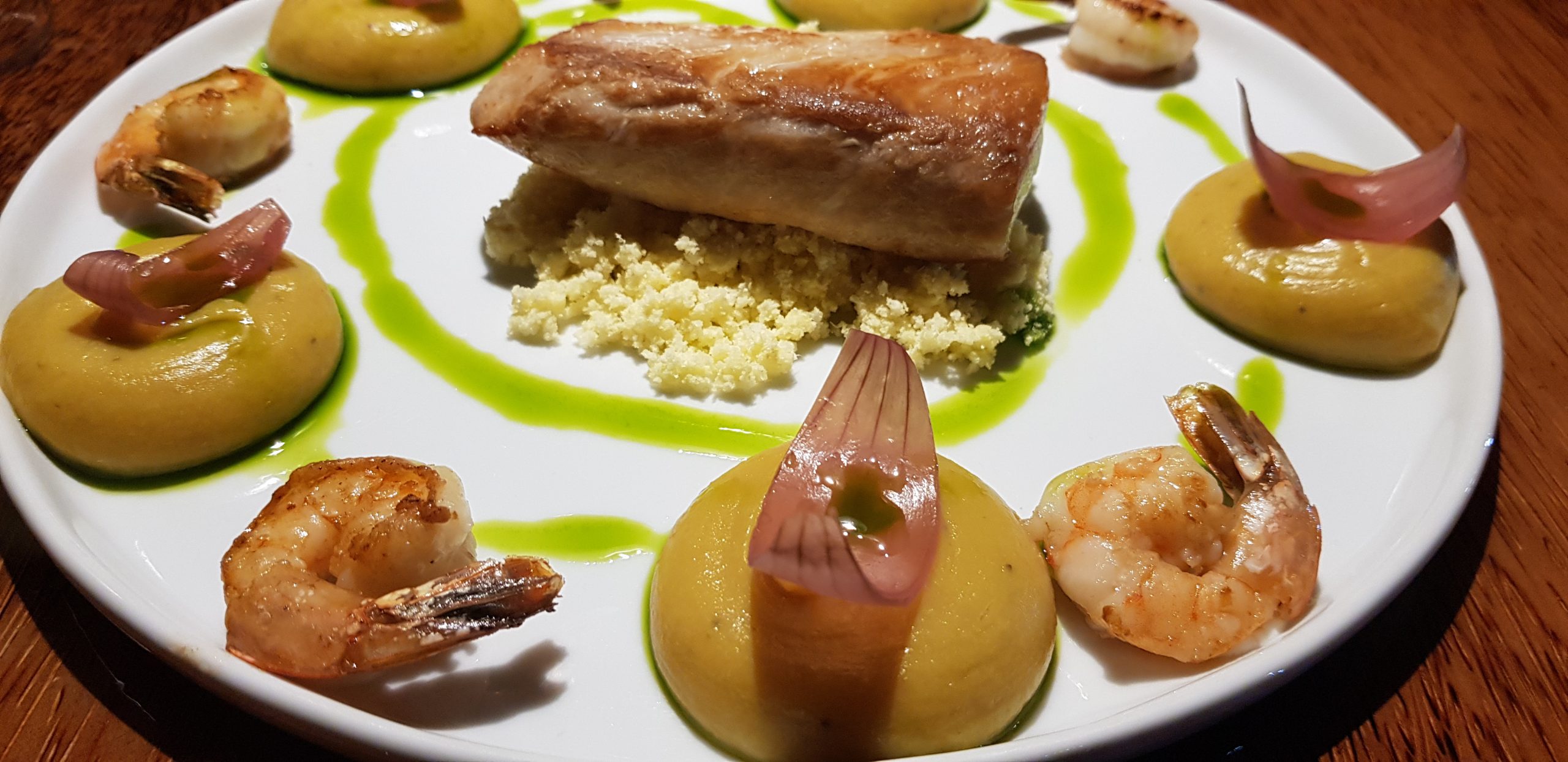 Filé de peixe com cuscuz de massa puba, purê de banana, camarões salteados na manteiga de garrafa, azeite verde, e picles de cebola roxa