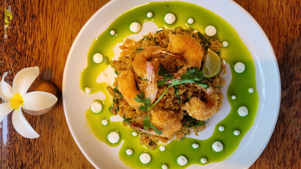 Arroz de aratu bem temperado, ainda tem camarões, azeite de rúcula e maionese aioli