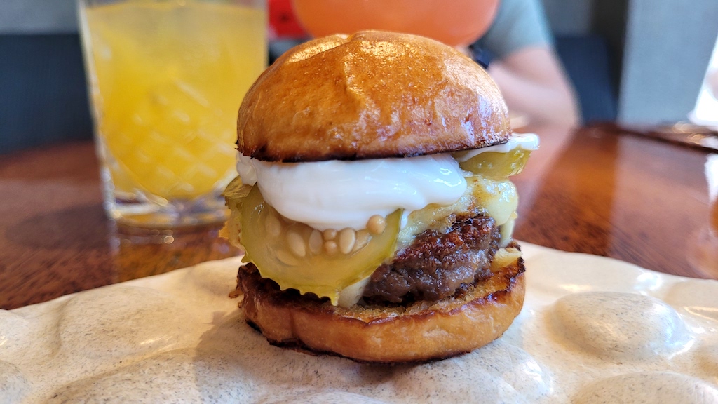 Outra novidade é a entrada com burguer de carne de sol (curada na casa), queijo coalho, picles de maxixe no pão de fruta (produção da cozinha do Aratu) com maionese de alho.