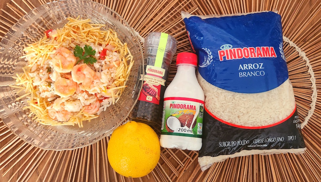 Como a Cooperativa Pindorama tem arroz branco, leite de coco e pimenta, apostei na receita Arroz de Camarão de Mãe, ou seja, juntei camarão com arroz, e incrementei com batata palha e raspas da casca de limão siciliano para dar aroma e frescor ao prato. Vamos fazer?