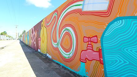 O paredão do emissário submarino da BRK Ambiental em Maceió foi transformado em uma grande galeria de arte ao ar livre pelo talento de seis artistas alagoanos – Didi Magalhães, Heway Verçosa, Joe Santos, Lívia Maya, Pedro Lucena e Yara Pão. Ao todo, mais de 400 metros de muro serviram para expressar o tema “Saneamento e Meio Ambiente”, de uma forma criativa e autêntica, valorizando a cultura, os artistas locais e as belezas naturais do estado, além de sensibilizar a sociedade para o tema.