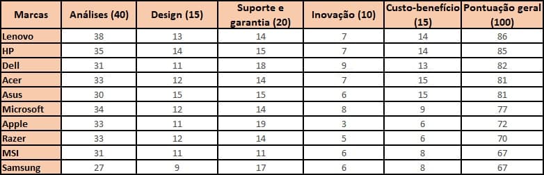 A Lenovo se destacou principalmente pelas ótimas avaliações para os seus notebooks - a empresa teve 38 de 40 pontos possíveis em reviews, e também se destacou em custo-benefício (14 de 15 pontos) e design (13 de 15 pontos).