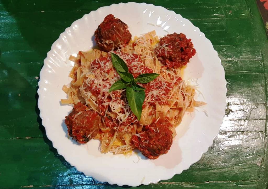 Talharim com almôndegas , ambos produzido na cozinha das Las Margaridas.
