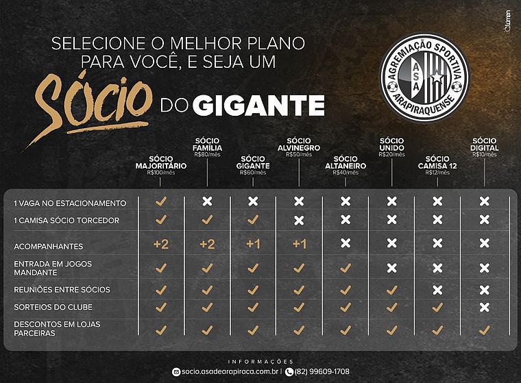 Todas elas têm uma contribuição mensal para o ASA. As modalidades Sócio Gigante com contribuição de R$ 60,00 e Sócio Família no valor de R$ 80,00 permaneceram e são bem requisitadas pelos torcedores.