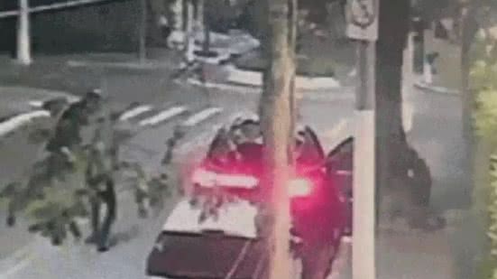Imagem de câmera de monitoramento flagrou o momento em que o criminoso chegou em uma moto e parou ao lado da porta do motorista com uma arma na mão. Um homem armado saiu pela porta traseira do lado da calçada, e outro do banco do carona, e atiraram no suspeito.