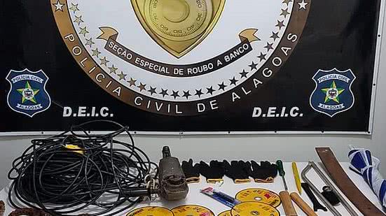 Os materiais usados para invadir uma agência bancária em Maceió, por um grupo preso na madrugada de quarta-feira (27), foram apreendidos pela Polícia Civil e revelam como a quadrilha atuava. Dentre os objetos apreendidos estavam fios, discos de corte, instrumentos para arrombamento, martelos, luvas, pés de cabras, chaves de fenda e um guarda-sol.