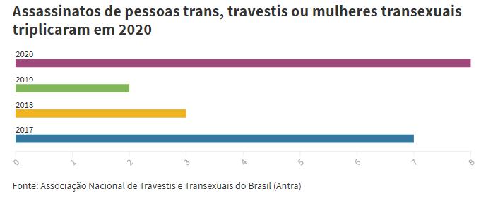 Ainda de acordo com o levantamento, foram registrados ao menos 175 assassinatos de pessoas trans, travestis e mulheres transexuais no Brasil, em 2020, um aumento de 41% em relação a 2019, quando o dossiê da entidade contabilizou 124 assassinatos.