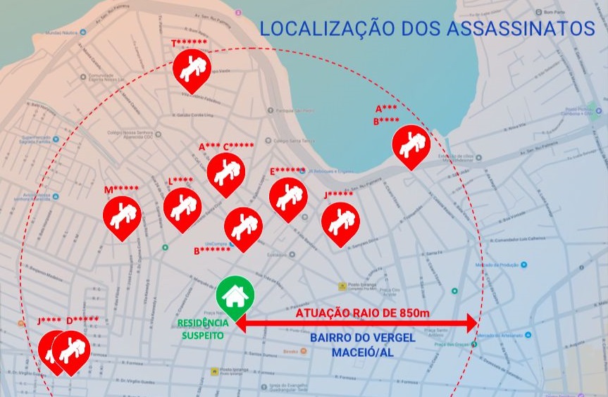 Todas as vítimas eram residentes no bairro onde o suspeito vivia e frequentava a igreja (atuação em um raio de 850 metros no Vergel do Lago). Também foi observado que Albino adotava um modo de operação característico, com atuação geralmente à noite e com vestimentas completamente pretas. A perícia identificou ainda que uma pistola Taurus PT 938 de calibre 380 foi usada nos crimes.