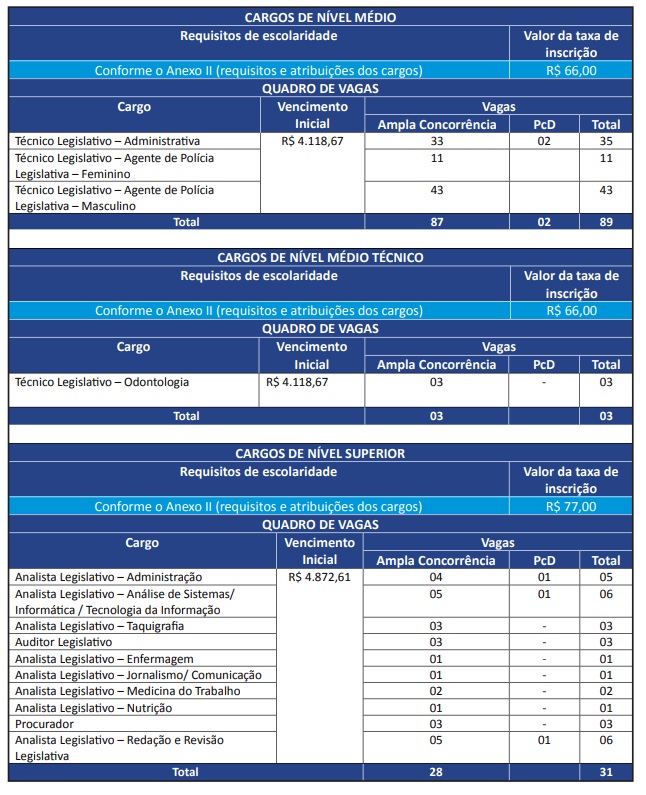 A Assembleia Legislativa do Estado da Bahia publicou no Diário Oficial desta sexta (26) o edital do concurso público para preenchimento de 123 vagas imediatas no órgão, com salários de R$ 4.118,67 a R$ 4.872,61.