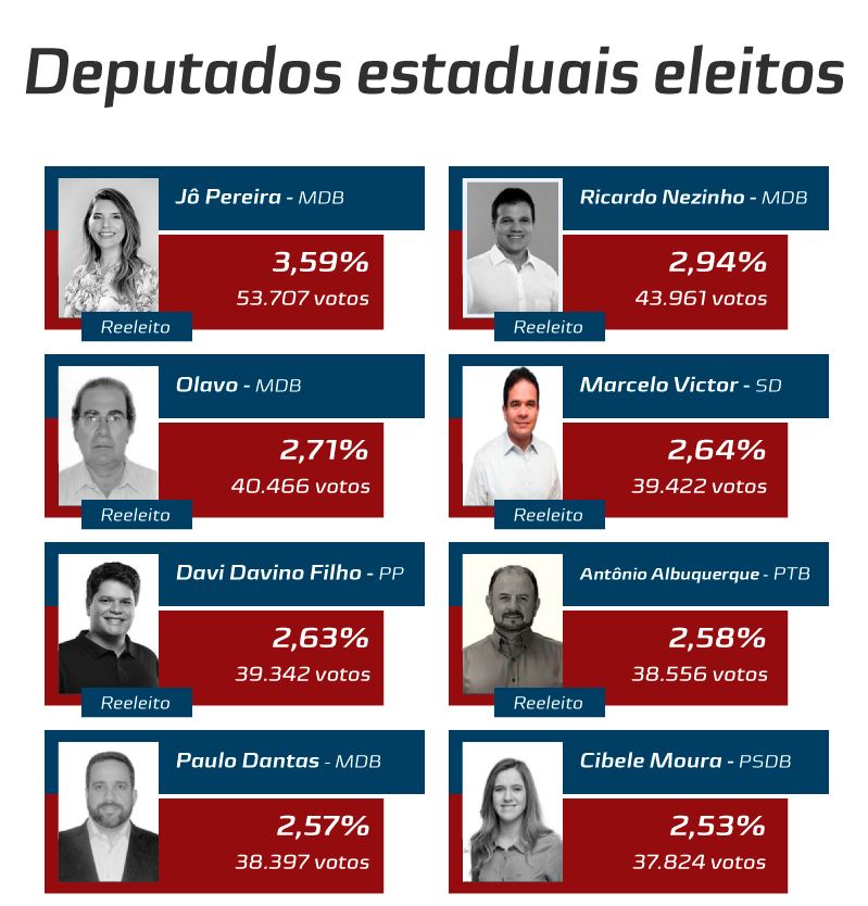 Assim como na Câmara Federal, a bancada de deputados na Assembleia Legislativa terá 44% de renovação para a próxima legislatura. Dos 27 atuais parlamentares, apenas 15 conseguiram se reeleger. Não conseguiram se eleger: Thaíse Guedes (PTB), Edval Gaia (PSDB), Pastor João Luiz (PSC) e Carimbão Júnior (Avante).