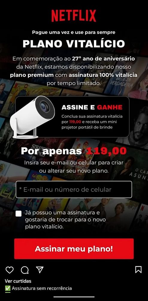 A oferta é tentadora. Uma assinatura vitalícia da Netflix por apenas R$ 119,00. Pois é. Muito bom para ser verdade. A promoção seria por conta do aniversário de 27 anos do streaming mais popular do mundo. E tem mais. Assinando, o cliente ainda ganharia um projetor de brinde.