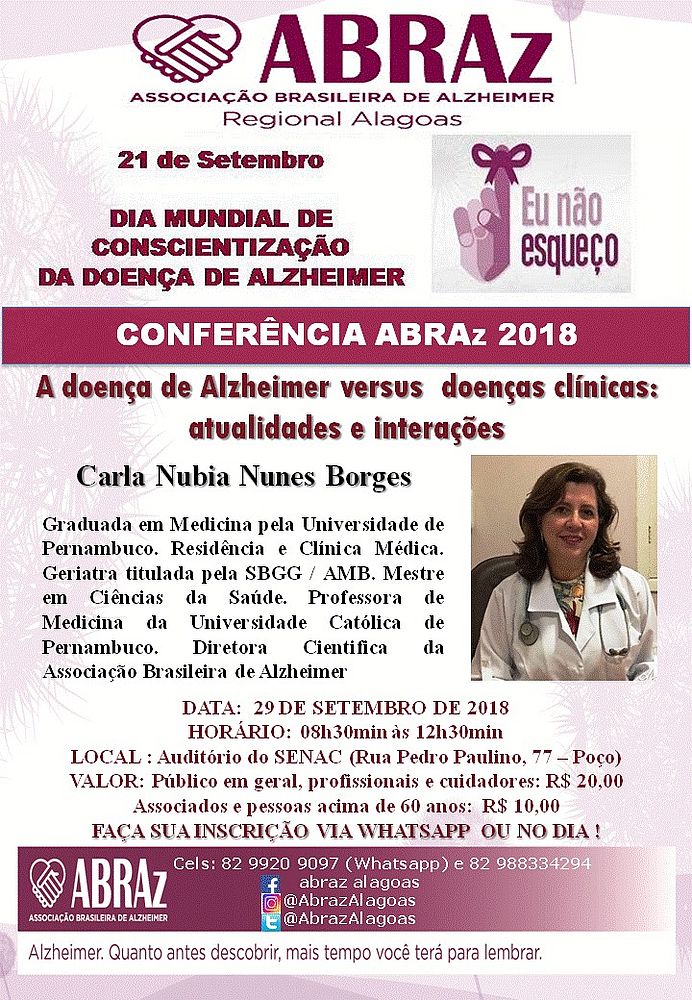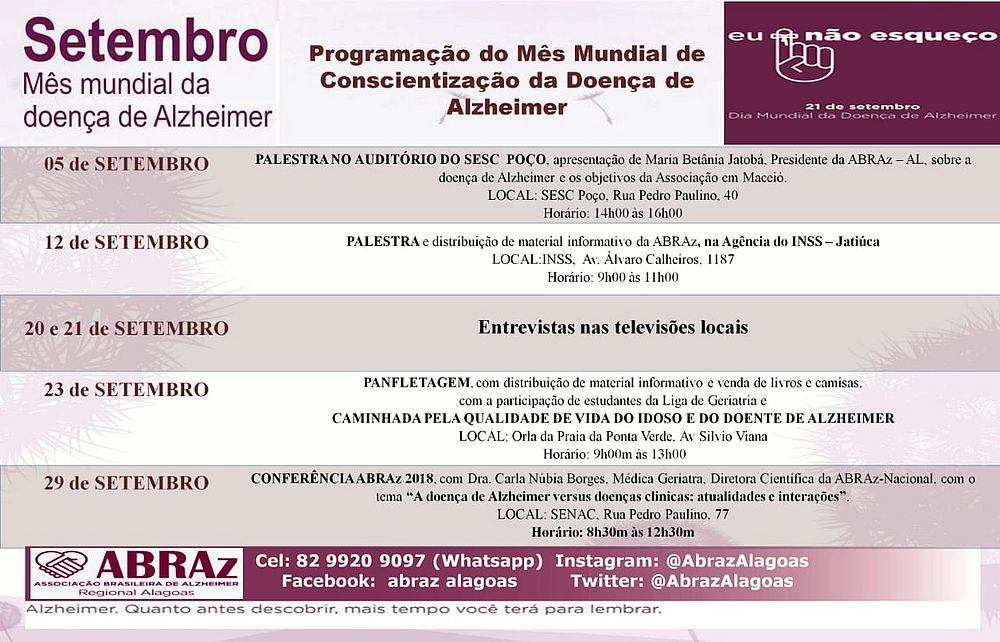 A Associação Brasileira de Alzheimer - Regional Alagoas (Abraz-AL) promove uma agenda de eventos em virtude do Mês de Conscientização da Doença de Alzheimer, que ocorre no mundo todo.