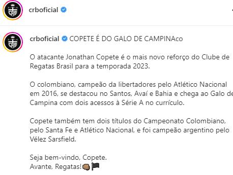 O CRB oficializou neste sábado, 14, a contratação do atacante Copete, que estava no Bahia, para a temporada de 2023. O anúncio do novo reforço, que já vinha sendo especulado na equipe regatiana há alguns meses, foi feito pelas redes sociais do clube.