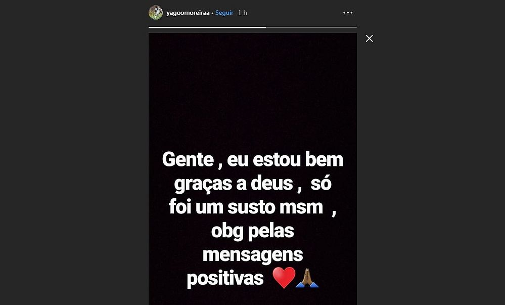 Em seu Instagram, o atacante postou uma mensagem se dizendo bem: "Gente, eu estou bem graças a Deus. Só foi um susto mesmo. Obrigado pelas mensagens positivas".
