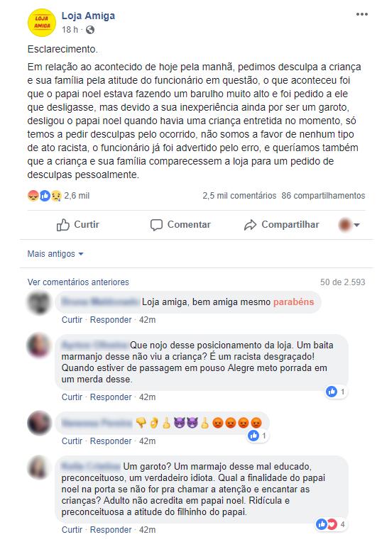 “Devido a sua inexperiência ainda por ser um garoto, – o funcionário – desligou o Papai Noel quando havia uma criança entretida no momento. Só temos a pedir desculpas pelo ocorrido, não somos a favor de nenhum tipo de ato racista, o funcionário já foi advertido pelo erro, e queríamos também que a criança e sua família comparecessem a loja para um pedido de desculpas pessoalmente”, ressaltava nota do estabelecimento.