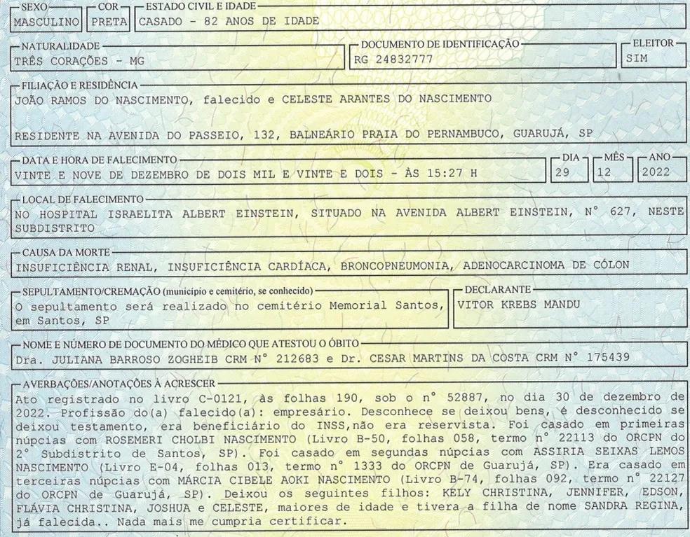 Segundo a certidão, Pelé morreu às 15h27 de quinta-feira (29), no Hospital Israelita Albert Einstein, em São Paulo, e deixou seis filhos vivos. Sandra Regina, que foi reconhecida depois de exames de DNA, morreu de câncer. Não há testamento conhecido, era beneficiário do INSS e foi casado por três vezes.