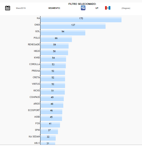 Pelo terceiro mês consecutivo o Ford Ka foi o modelo mais vendido em Alagoas, superando o líder nacional GM Onix. Em Maio a diferença de emplacamento entre os modelos aumentou para 33 unidades.