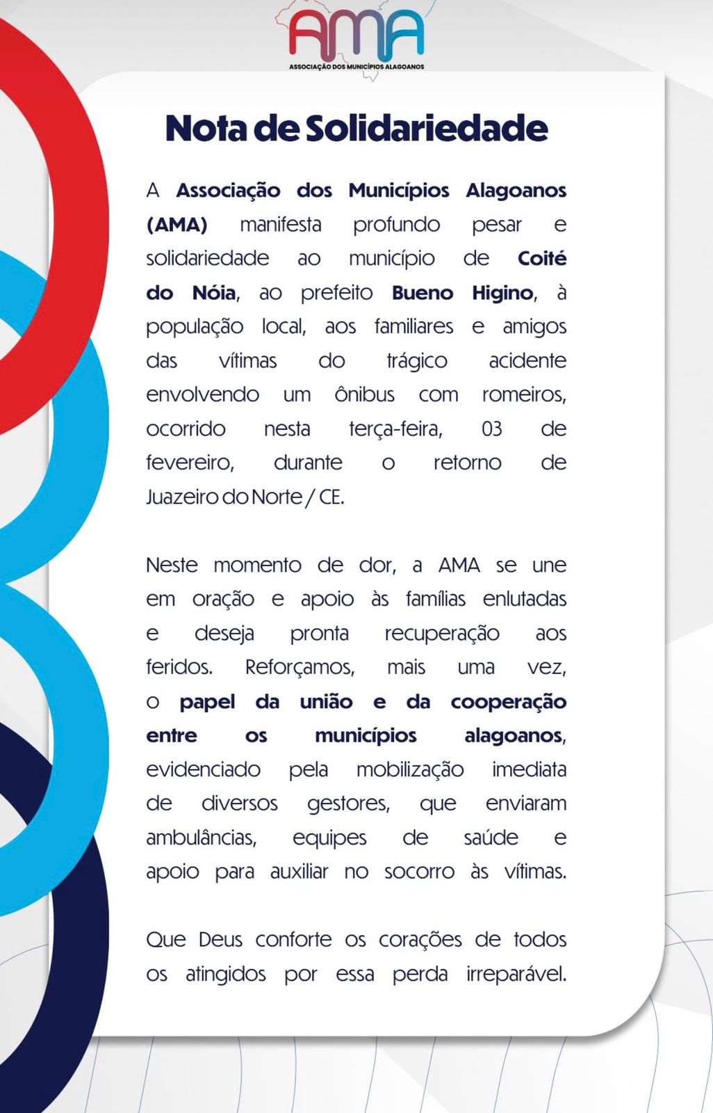 A Associação dos Municípios Alagoanos (AMA) também divulgou uma nota de solidariedade às vítimas e ao prefeito de Coité do Nóia, cidade de origem dos fiéis.