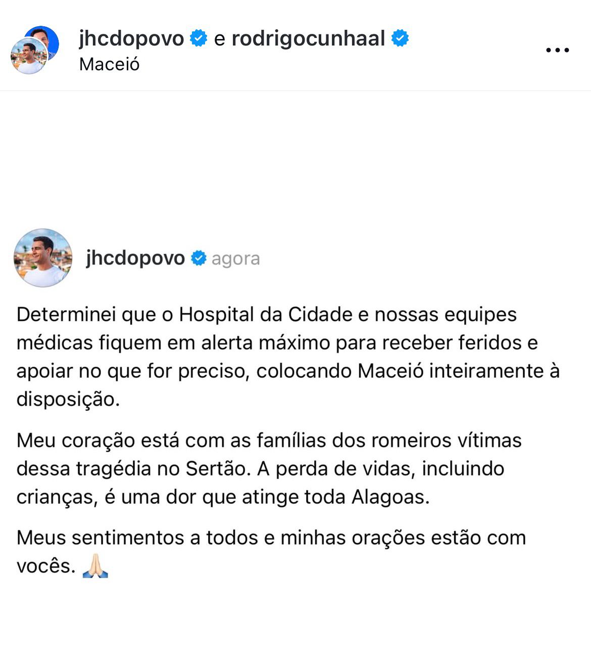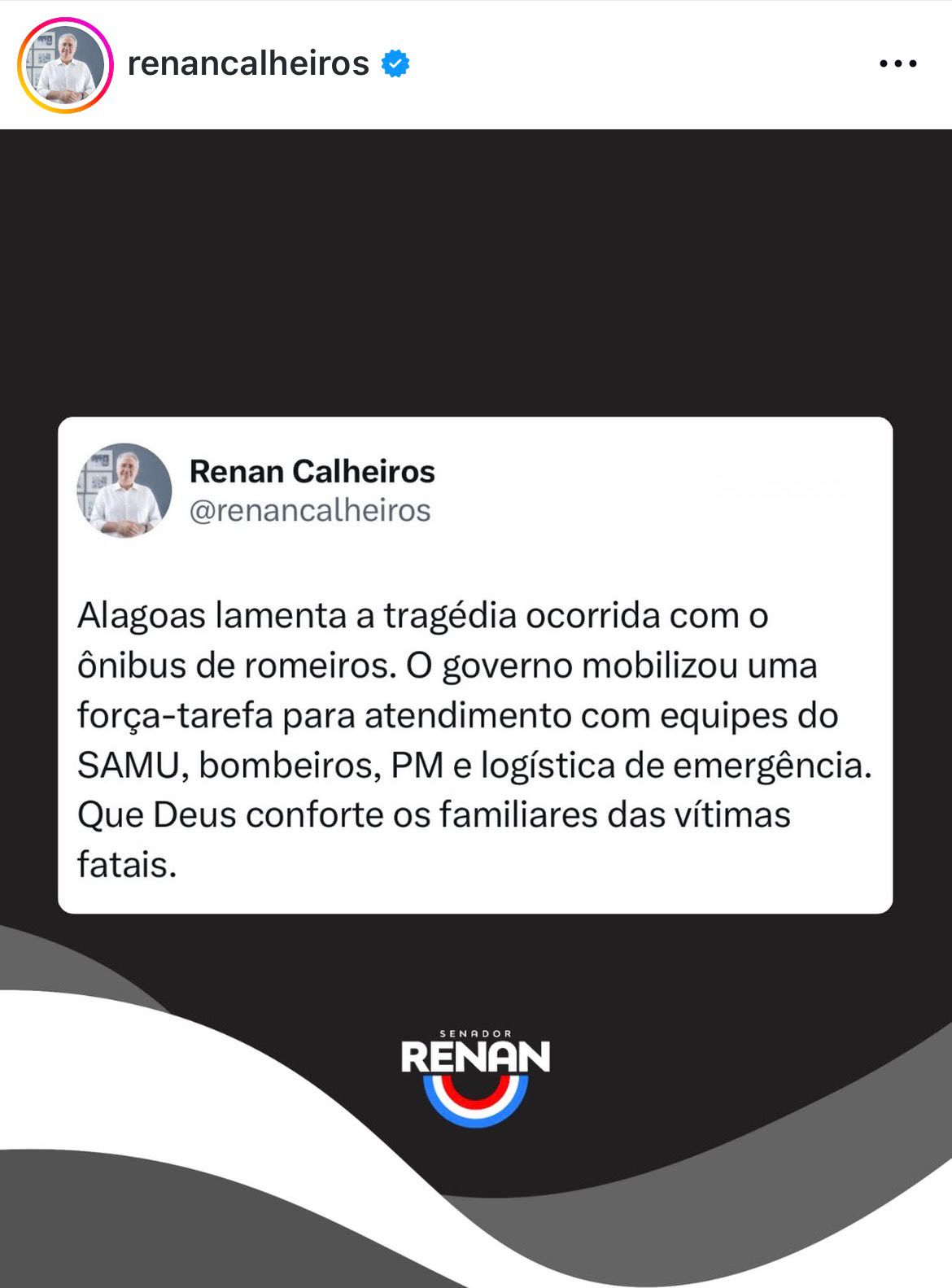 Outra autoridade a se manifestar foi o senador Renan Calheiros. Em publicação feita no Instagram, ele lamentou o ocorrido e se solidarizou com as famílias das vítimas.