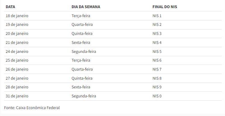 O cronograma de janeiro será encerrado dia 31, com o pagamento para quem tem NIS terminado em 0.