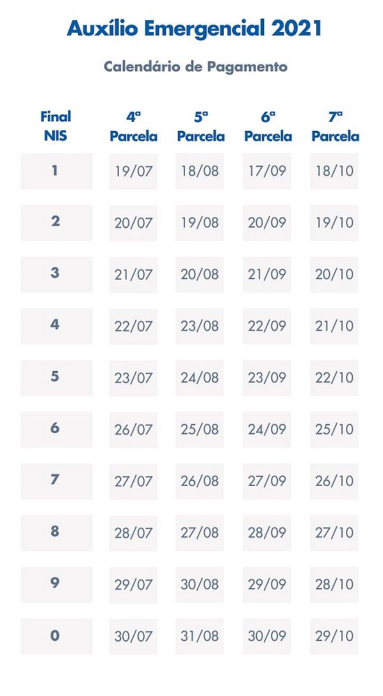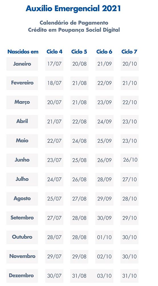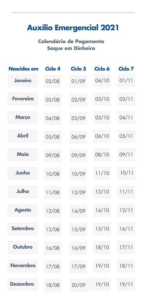Veja abaixo o calendário de crédito do auxílio das 6ª e 7ª parcelas: