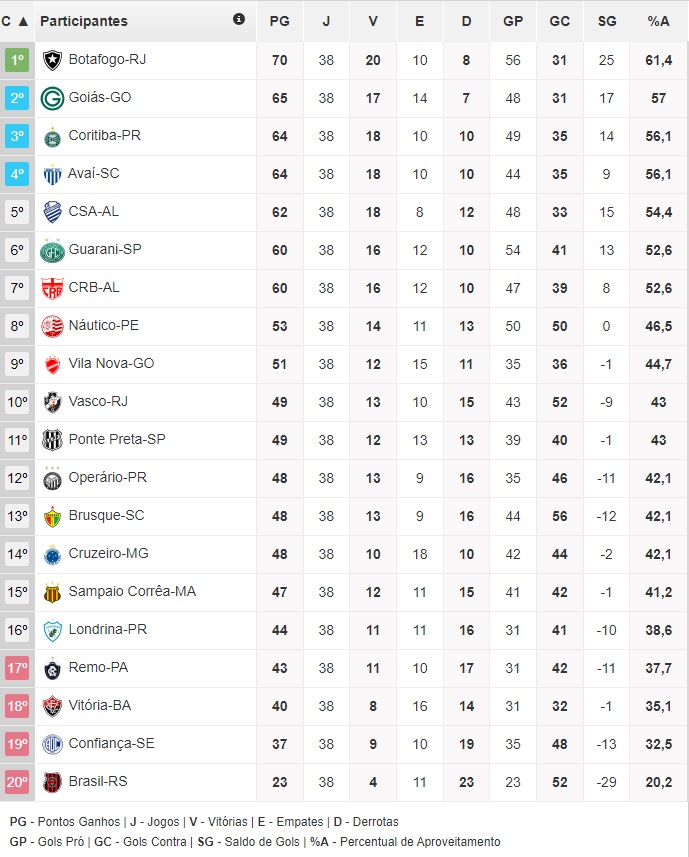 Quem terminou na quinta colocação foi o CSA, que goleou o Brasil-RS por 4 a 0 no Rei Pelé e encerrou a competição com 62 pontos. No Rio de Janeiro, o Guarani empatou com o campeão Botafogo em 2 a 2 e fechou a Série B com 60 pontos, na sexta posição. No Paraná, o CRB foi derrotado pelo Operário por 2 a 1 e ficou na sétima colocação, com 60 pontos.