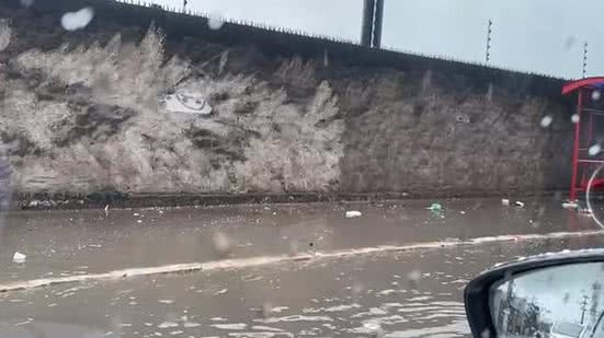 Em um determinado ponto da Avenida, a parada de ônibus ficou completamente alagada, inviabilizando a permanência de usuários para aguardar o transporte. Veja o vídeo enviado para o TNH1: