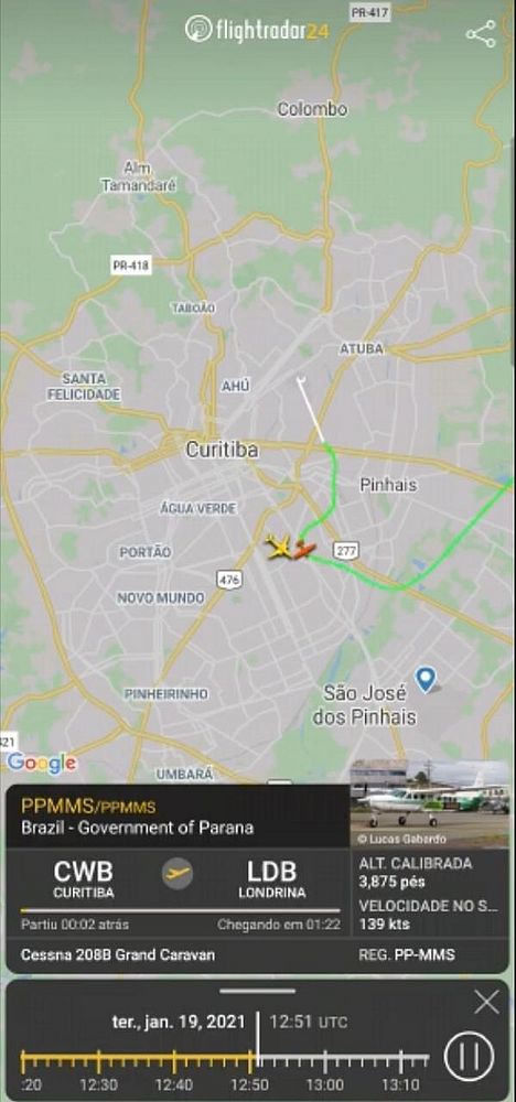 O monomotor do governo saiu de Curitiba rumo a Londrina. O avião da Gol saiu de Cumbica, em Guarulhos, na Grande São Paulo.