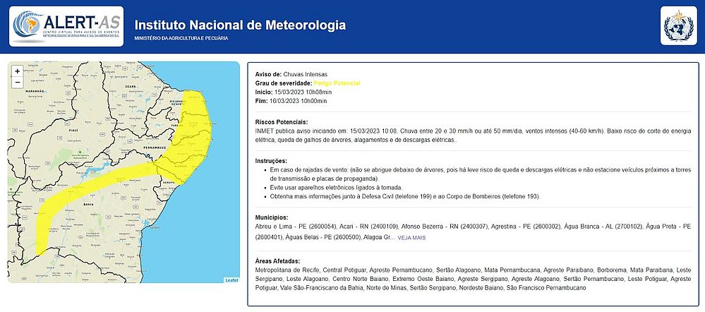 Inmet - Também responsável pelo monitoramento meteorológico, o Instituto de Nacional de Meteorologia (Inmet) emitiu um alerta de chuvas, com grau de severidade classificado como perigo potencial para municípios do Sertão, Agreste e Leste de Alagoas. Este alerta tem validade até às 10h de quinta-feira (16).