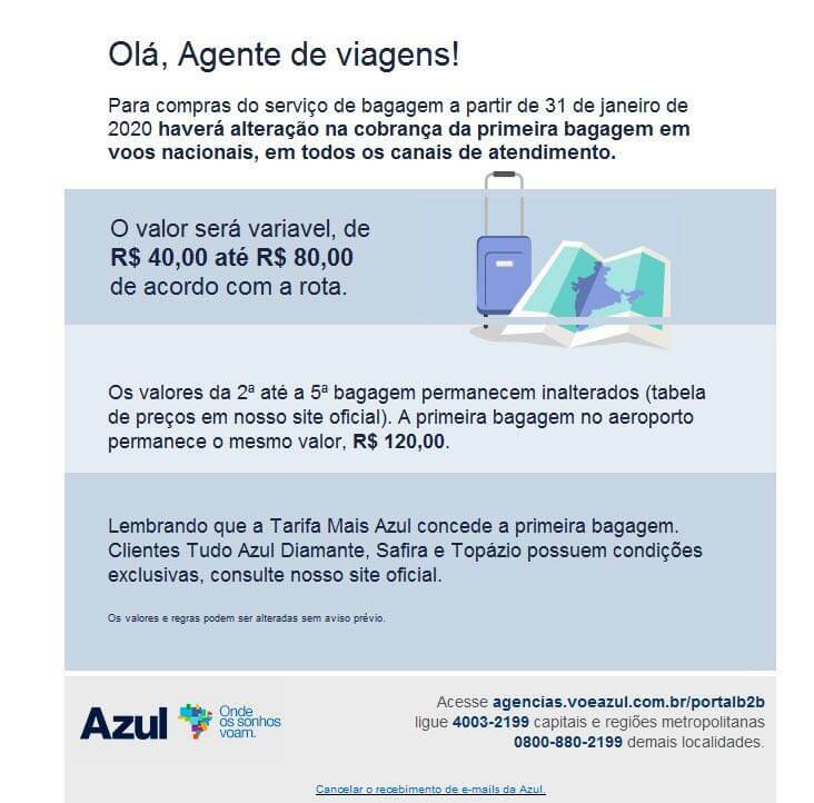 A Azul passou a cobrar valores dinâmicos para as bagagens despachadas em todos os seus voos nacionais. A mudança vale apenas para a compra antecipada do primeiro volume, que antes tinha o valor fixo de R$60 e agora poderá custar entre R$40 e R$80, a depender da rota. O valor para compra da primeira bagagem despachada no balcão do aeroporto permanece R$120.