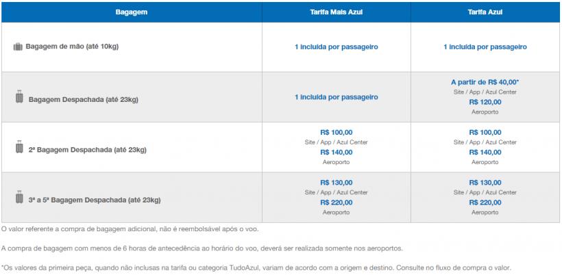 Veja a tabela completa das cobranças de bagagem disponibilizada no site da Azul: