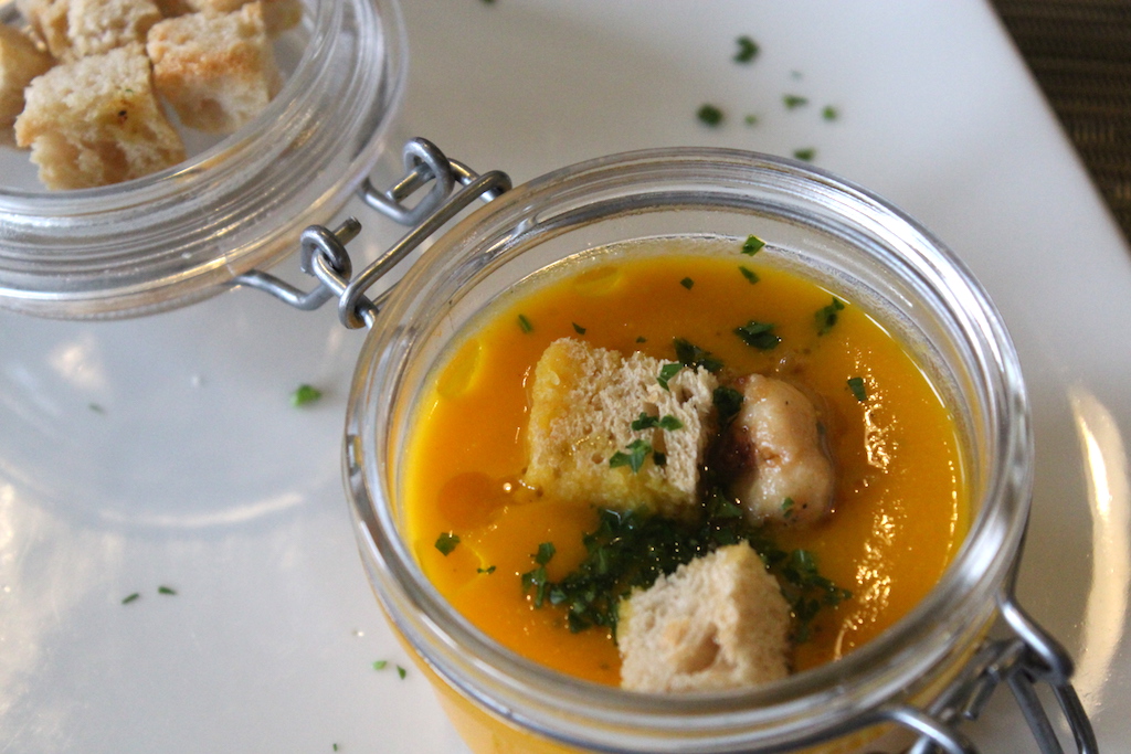 Entrada: caldo de cenoura com lagosta, leve e elegante ao paladar