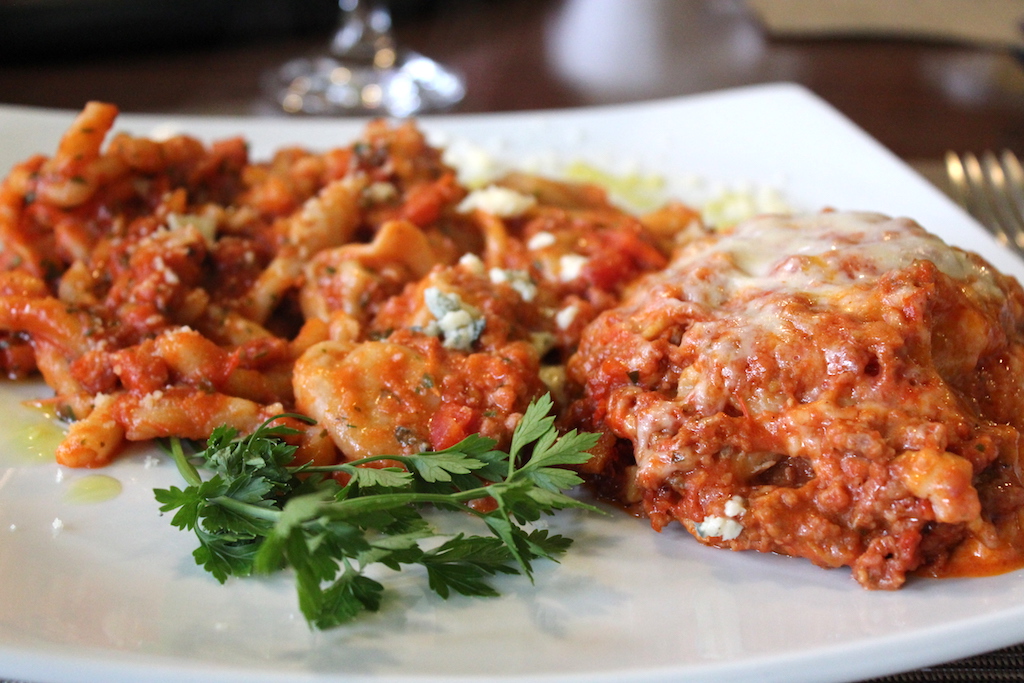 Nessa foto, são três massas caseiras: lasanha tradicional da casa, ravióli recheados com espinafre fresco, ricota, parmesão, molho tomate, manjericão e pimenta. Para completar o trio, strozzapreti (massa lembra parafuso) com molho amatriciana (feito com cebola, alho, bacon e molho tomate). Detalhe: amatriciana vem do nome da cidade italiana Amatrice.