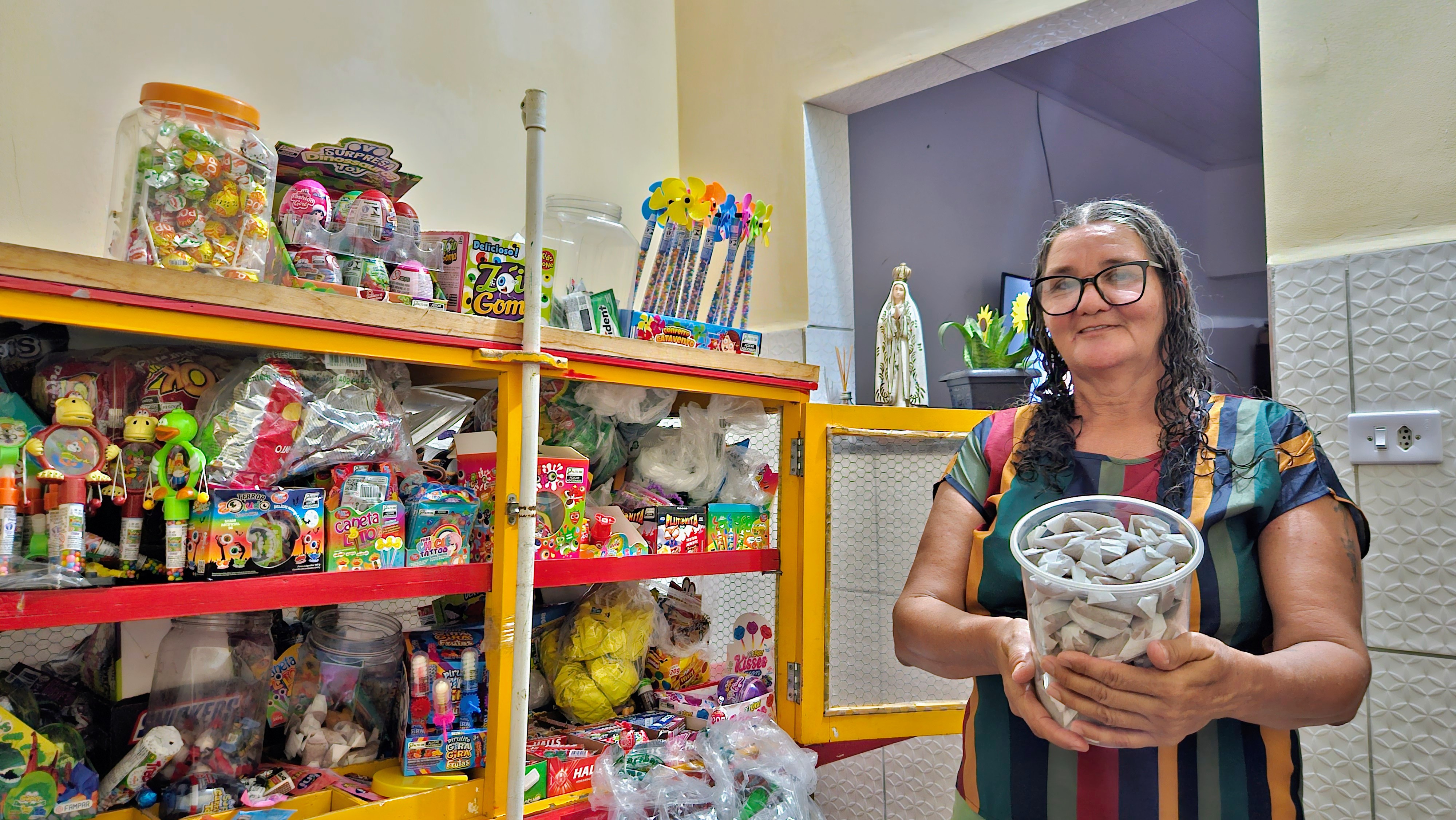 A alagoana não tem loja, vende a bala e outros lanches na porta de duas escolas, uma faculdade e na Igreja com sua vendinha de duas rodas. Patrícia é ambulante empreendedora.