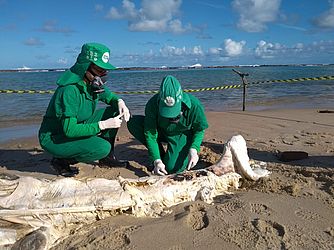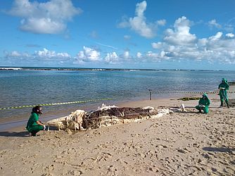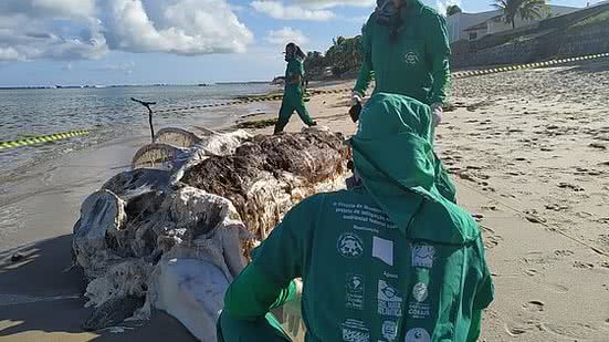 De acordo com o Biota, o animal, em avançado estado de decomposição, mede 6,97 metros de comprimento. A espécie ainda não foi identificada e a equipe vai realizar exames para tentar identificar a causa da morte.