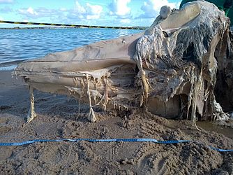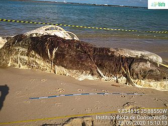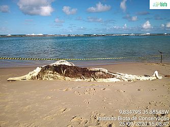 Uma baleia em estado avançado de decomposição encalhou, nesta sexta-feira (25), em um trecho na praia da Barra de São Miguel, Litoral Sul de Alagoas. As informações são do Instituto Biota, que enviou uma equipe ao local.