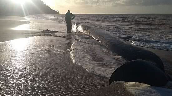 Segundo o Biota, a Baleia-fin (Balaenoptera physalus) se encontra em uma área de difícil acesso na praia. O instituto também informou que ela tem 13 metros de comprimento e está debilitada, magra e com diversas escoriações pelo corpo.